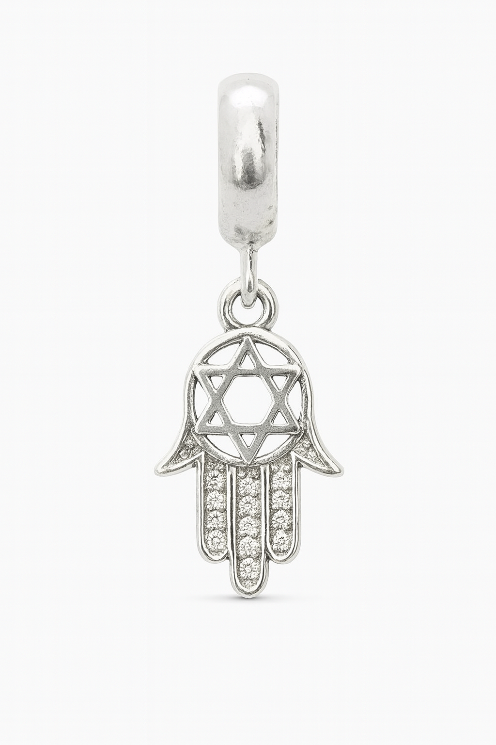 A parte inferior da peça possui micro pedras claras aplicadas com precisão, criando um brilho suave e elegante. Com acabamento polido e traços finos, o berloque combina espiritualidade e sofisticação, sendo perfeito para compor pulseiras com propósito, estilo e significado.