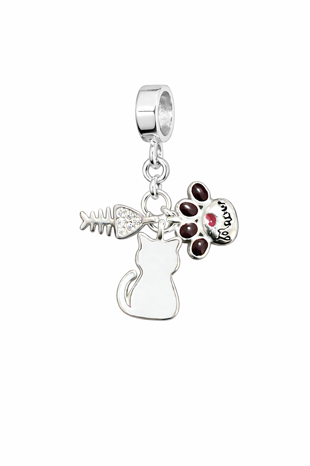 Berloque em prata com composição delicada que celebra o amor pelos pets. O design reúne três símbolos encantadores: a silhueta de um gatinho, a patinha com detalhe em esmalte e coração central, e o ossinho com brilho sutil, formando uma peça cheia de significado e carinho. O acabamento polido realça o brilho da prata, enquanto os detalhes trazem um toque lúdico e afetivo. Compatível com pulseiras padrão, é o berloque perfeito para quem deseja carregar a paixão e a conexão especial com seu pet em todos os momentos.