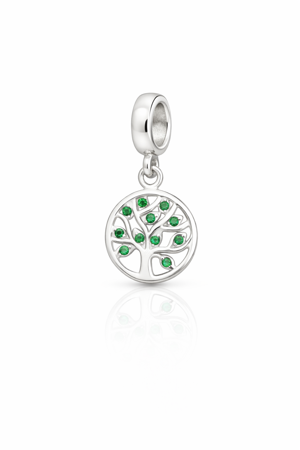 Berloque em prata com design delicado da Árvore da Vida, símbolo de crescimento, força e conexão com as raízes. O formato circular envolve galhos elegantes cravejados com pedras verdes luminosas, que representam renovação, equilíbrio e prosperidade. O acabamento polido realça o brilho da prata e destaca cada detalhe do desenho, criando uma peça sofisticada e cheia de significado. Compatível com pulseiras padrão, é o berloque ideal para quem deseja carregar proteção, energia positiva e um toque de elegância no dia a dia.