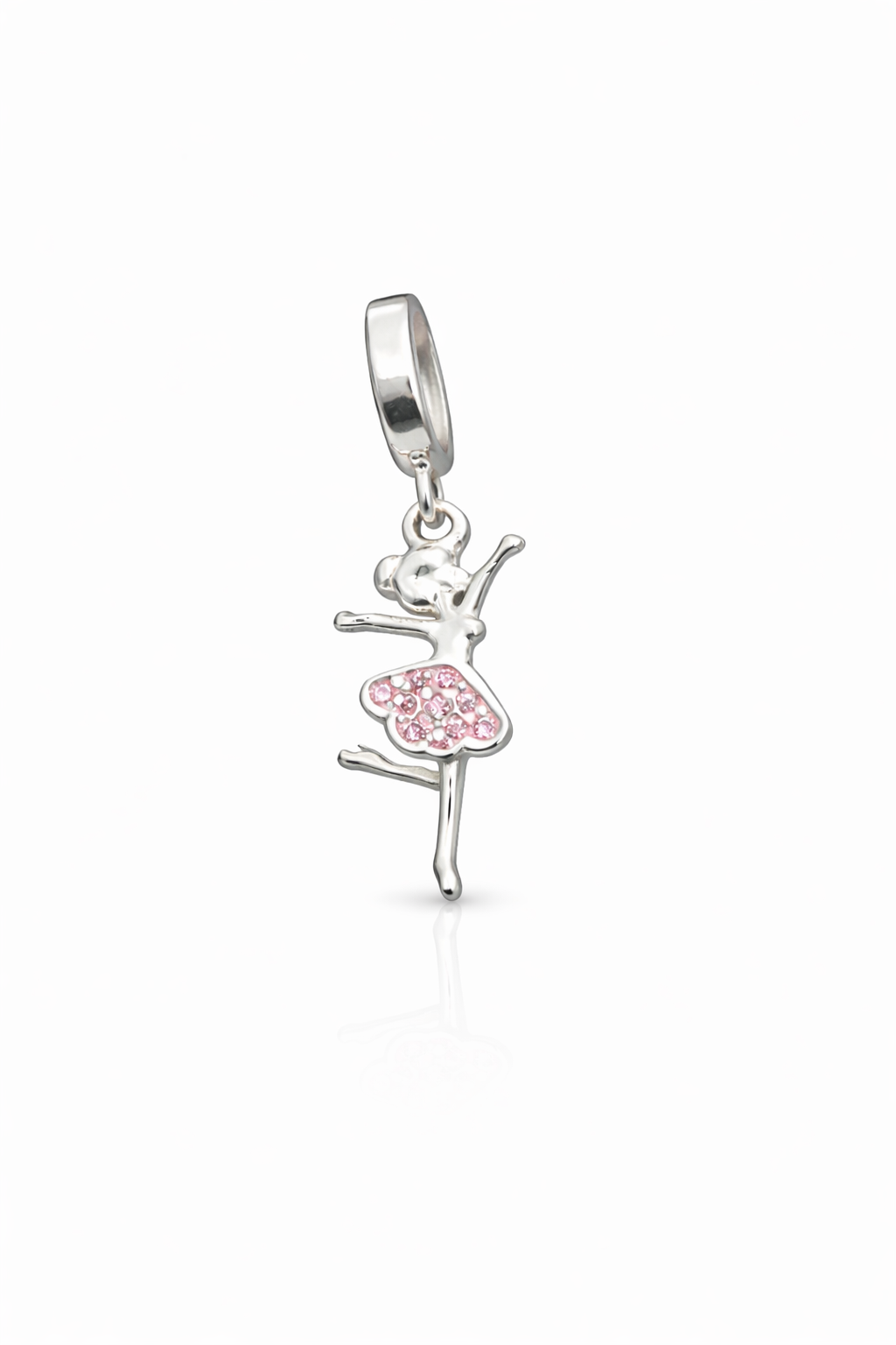 Delicado e cheio de encanto, este berloque em prata traz o desenho gracioso de uma bailarina, simbolizando leveza, sonhos e paixão pela dança. O destaque fica para o vestido com pedras em tom rosa, que adicionam brilho suave e um toque feminino à peça.