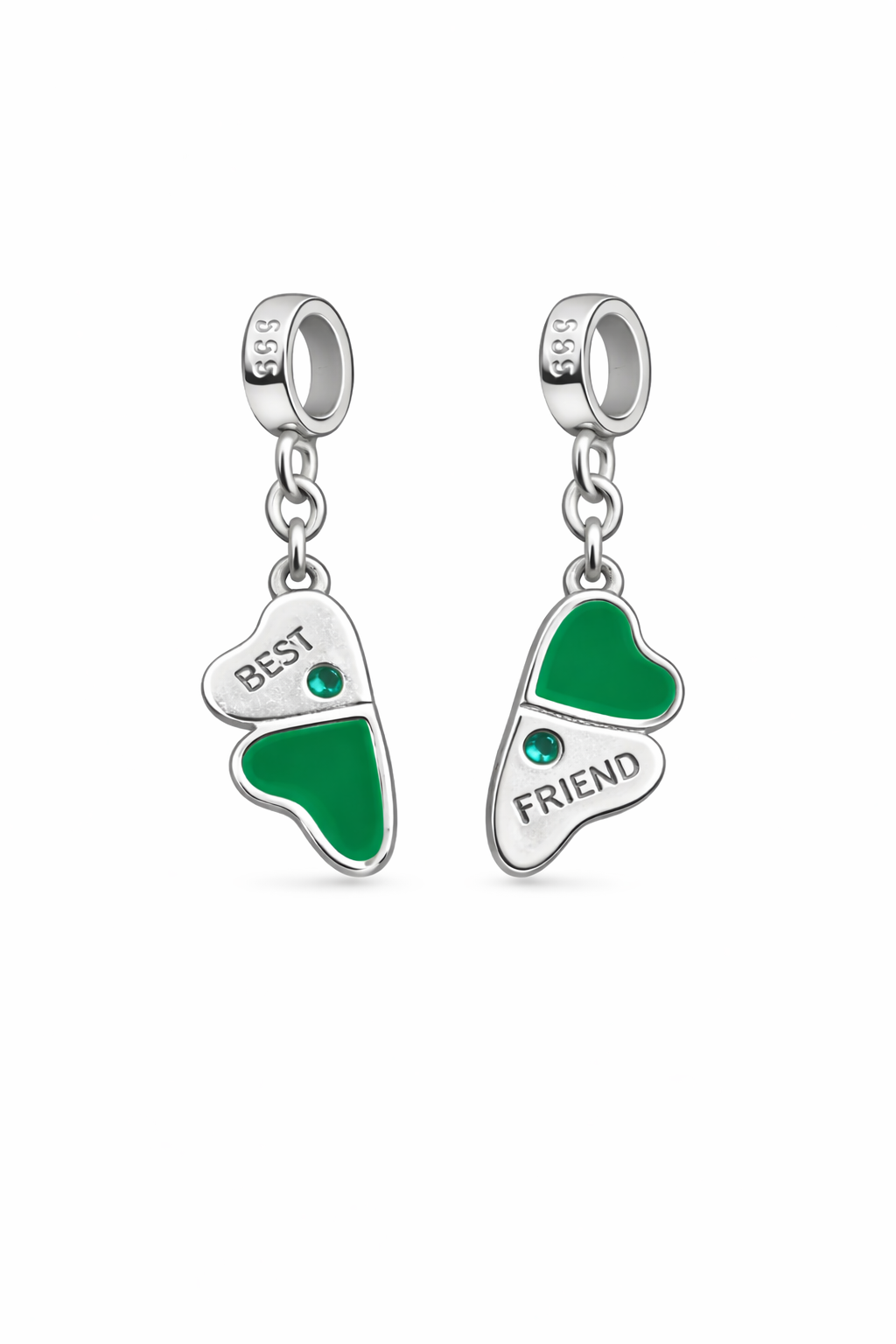 Berloque em prata com design dividido em dois corações, simbolizando a união e a conexão verdadeira entre melhores amigas. Cada metade traz detalhes esmaltados em verde vibrante e ponto de brilho delicado, formando juntos a mensagem “Best Friend”, que representa amizade, cumplicidade e momentos inesquecíveis. O acabamento polido valoriza o brilho da prata e destaca o contraste moderno do esmalte, criando uma peça cheia de significado e estilo. Compatível com pulseiras padrão, é o berloque perfeito para eternizar laços especiais e carregar sua melhor amizade sempre com você.