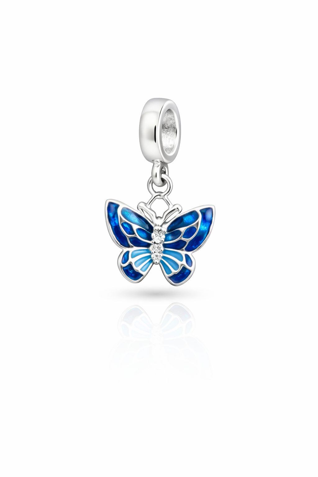Berloque em prata com design de borboleta, símbolo de transformação, leveza e novos começos. As asas recebem esmaltação em tons de azul vibrante com efeito luminoso, criando profundidade e destaque, enquanto o corpo é adornado por delicadas pedras que adicionam brilho sutil à peça. O acabamento polido valoriza a intensidade da cor e o reflexo da prata, resultando em um berloque elegante e cheio de significado. Compatível com pulseiras padrão, é a escolha perfeita para representar liberdade, renovação e beleza em cada detalhe.