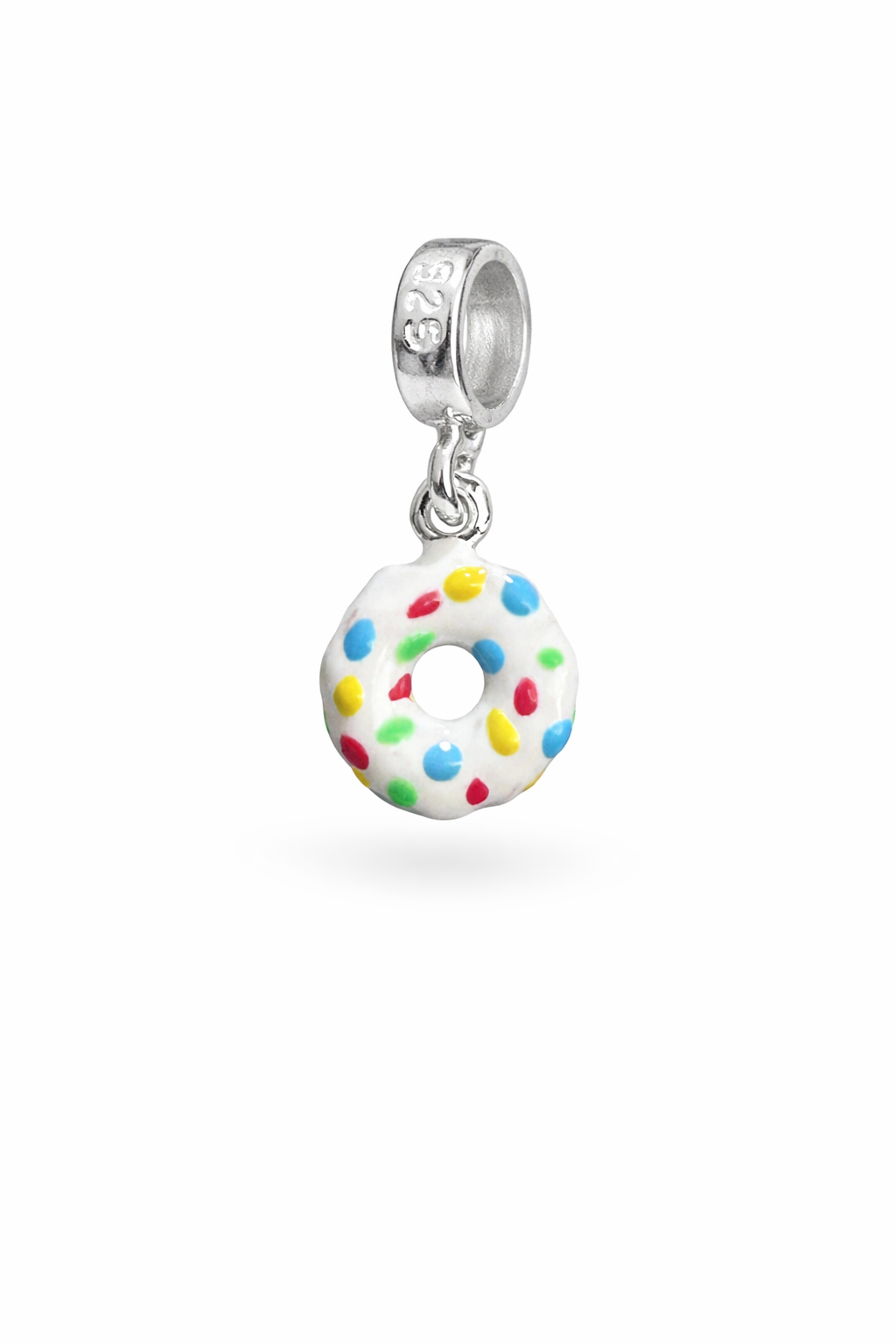 Delicado e divertido, este berloque em prata traz o formato de um donuts com cobertura branca esmaltada e confeitos coloridos, criando um visual leve, alegre e cheio de personalidade. O acabamento detalhado valoriza cada cor, deixando a peça ainda mais charmosa e única.