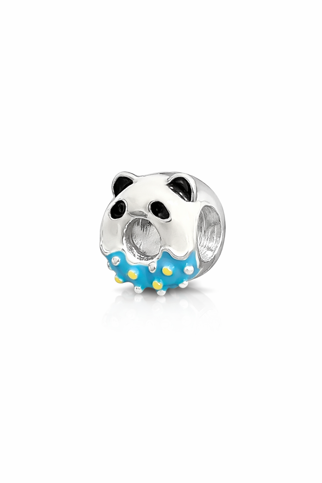 Delicado e divertido, este berloque em prata traz o formato de um donuts inspirado em panda, com acabamento esmaltado e detalhes que destacam o contraste do preto com o azul suave. Uma peça charmosa, moderna e cheia de personalidade.