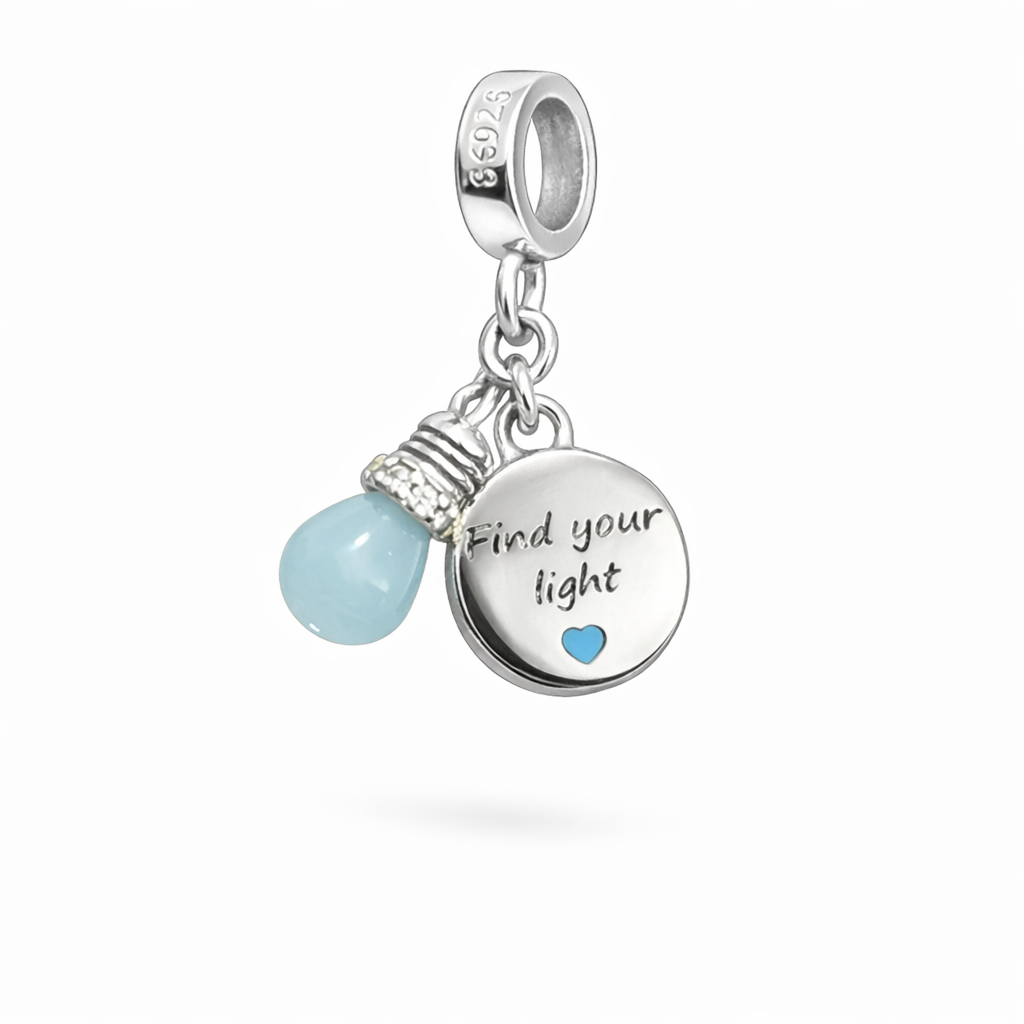Berloque em prata com design delicado inspirado em luz e significado, trazendo pingente de lâmpada em tom suave e medalha gravada “Find your light” com detalhe de coração. Uma peça simbólica e elegante, perfeita para representar inspiração, força e positividade no seu mix de berloques. Compatível com pulseiras padrão, adiciona brilho, leveza e propósito à sua composição.
