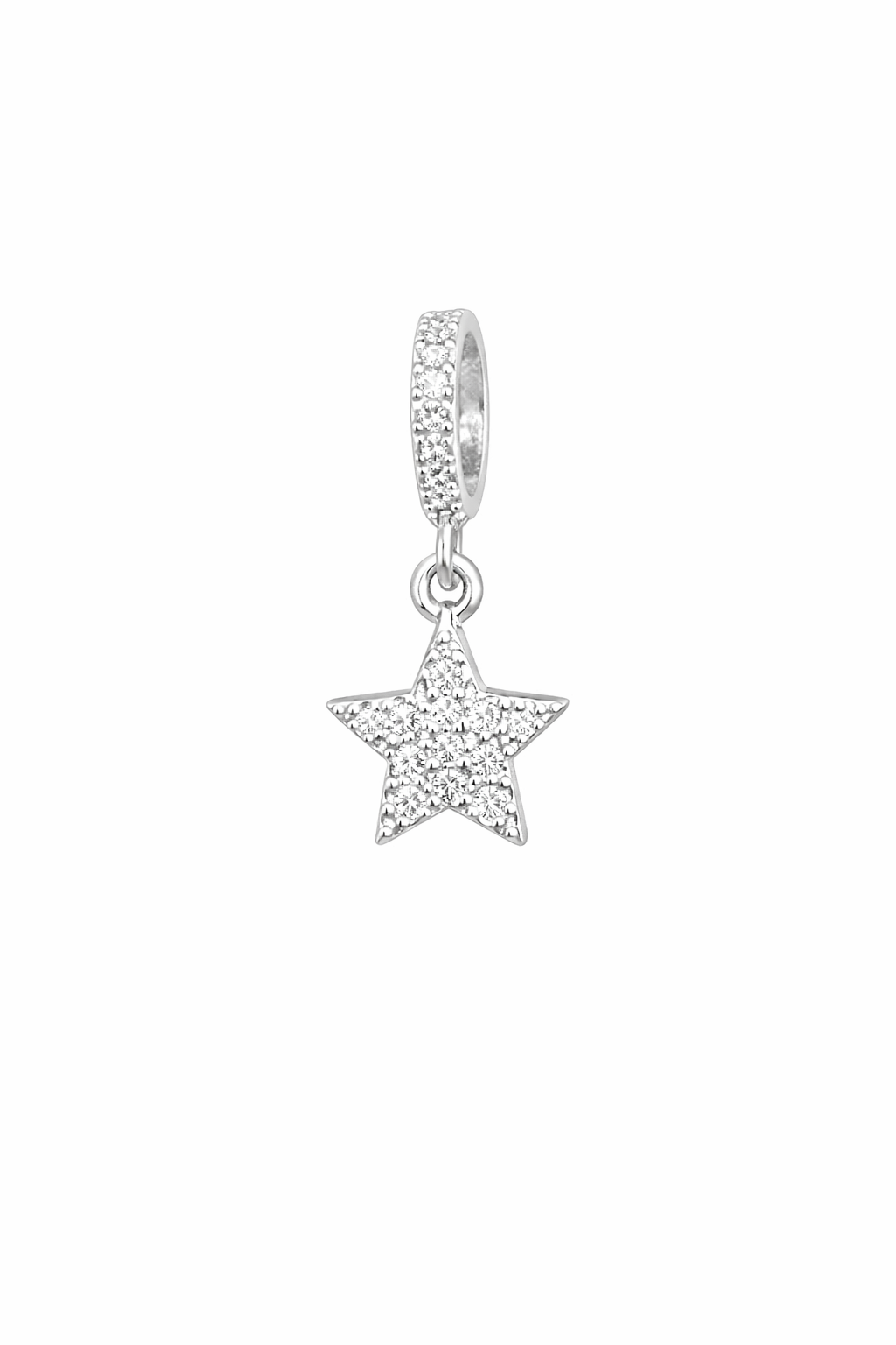 Clássico e luminoso, este berloque em prata traz o símbolo da estrela totalmente cravejado, refletindo brilho intenso e significado de luz, proteção e realização. Uma peça delicada que adiciona destaque e sofisticação à composição da sua pulseira.