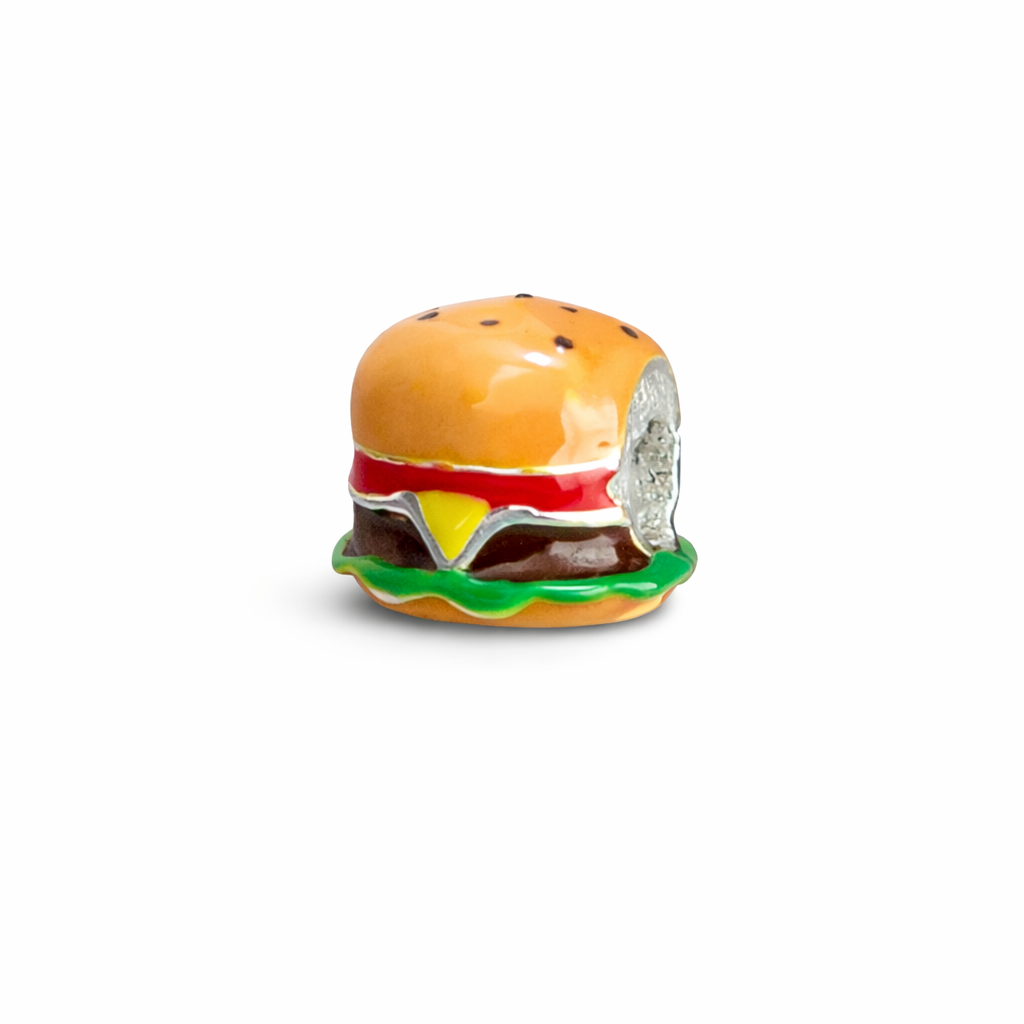 Um berloque em prata divertido e cheio de personalidade, com design de hambúrguer esmaltado em cores vibrantes que destacam cada detalhe — pão, queijo, carne e alface. Uma peça criativa que traz um toque descontraído e moderno para a sua pulseira.