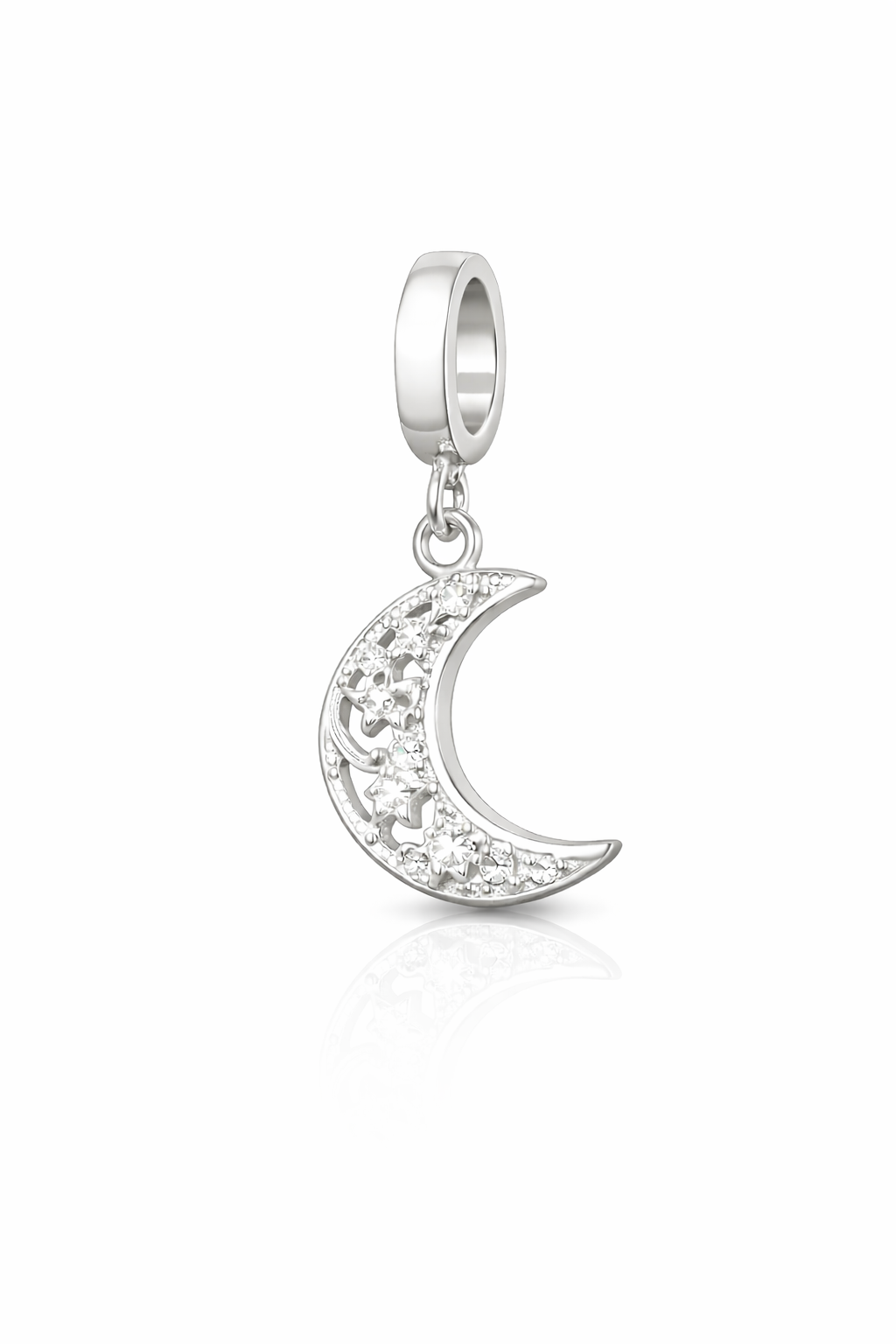 Encantador e cheio de brilho, este berloque em prata traz o delicado formato de lua crescente com estrelas vazadas e microcravejadas, criando um efeito luminoso e sofisticado. Um símbolo de sonhos, proteção e novos ciclos, perfeito para compor combinações com significado e personalidade.