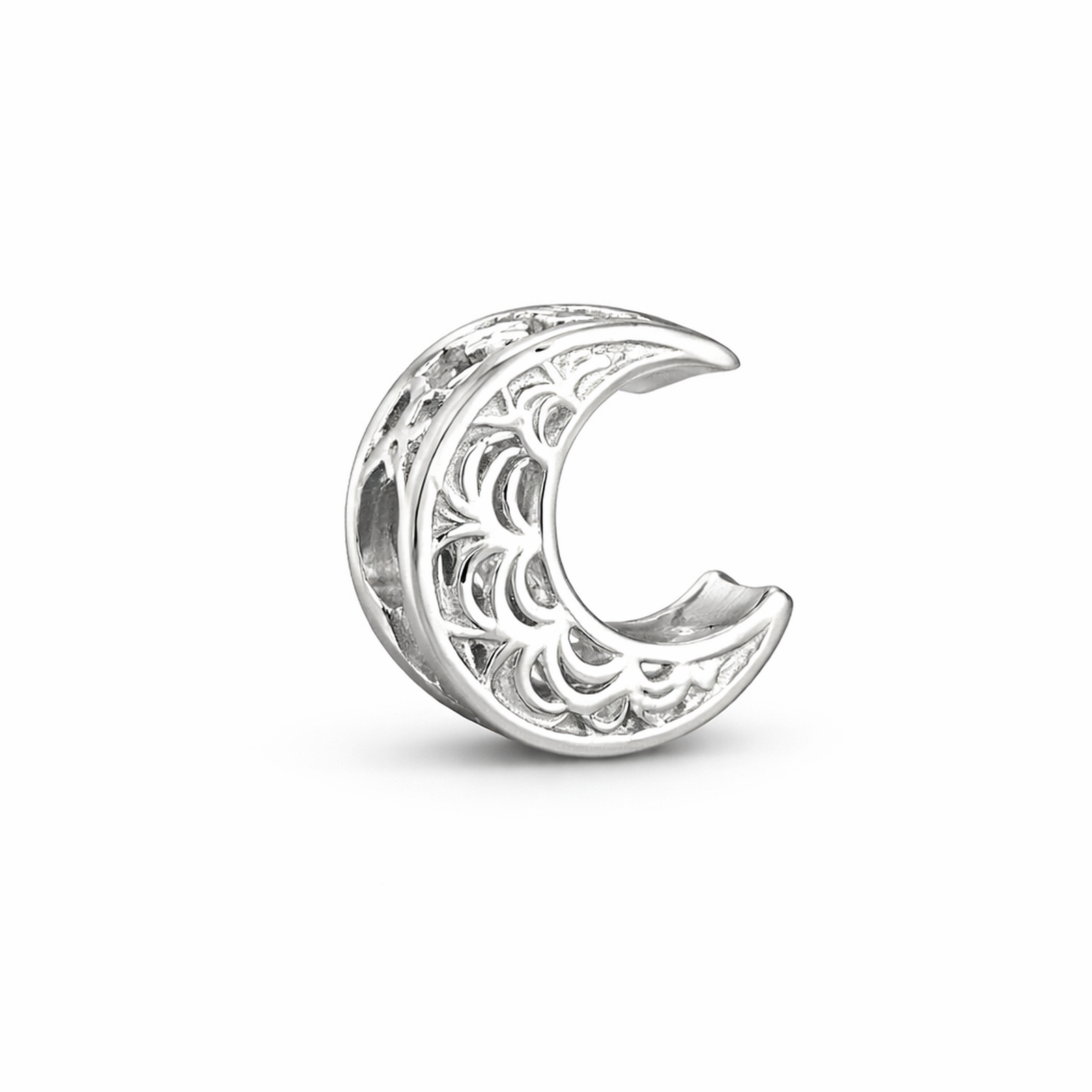 Inspirado na beleza do céu noturno, o berloque Lua Trabalhada é confeccionado em prata e traz um design delicado com detalhes vazados que criam leveza e sofisticação. O formato de lua crescente com acabamento ornamental destaca o brilho natural da prata e adiciona um toque místico e elegante à pulseira.