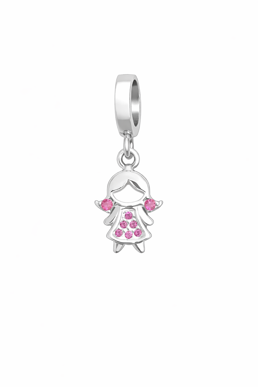 Berloque Prata em formato de menina, simbolizando amor, cuidado e laços eternos. A peça recebe delicadas zircônias em tom rosa, que iluminam o design com um brilho suave e feminino, destacando cada detalhe com elegância. Produzido em prata italiana clara, com acabamento polido e aparência sofisticada.