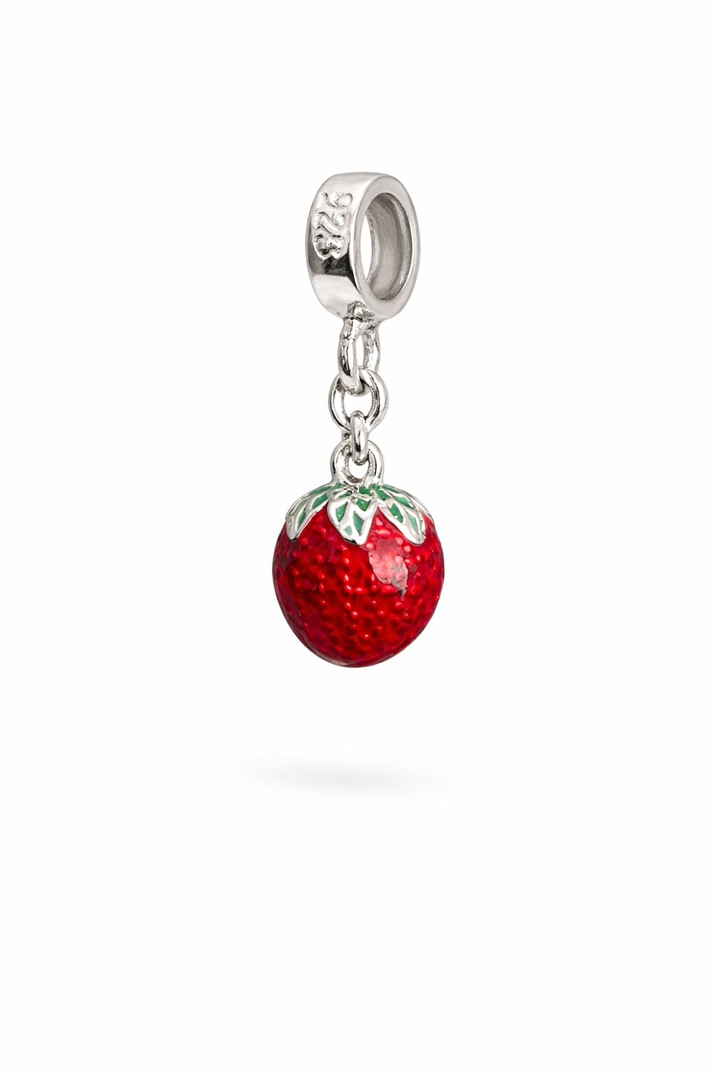 Berloque em prata com design delicado de morango, acabamento esmaltado em vermelho vibrante e detalhes em verde que realçam o brilho e a riqueza da peça. Um berloque charmoso, alegre e cheio de personalidade, perfeito para compor pulseiras com um toque doce e sofisticado. Compatível com pulseiras padrão, é ideal para quem ama detalhes únicos e marcantes em prata.