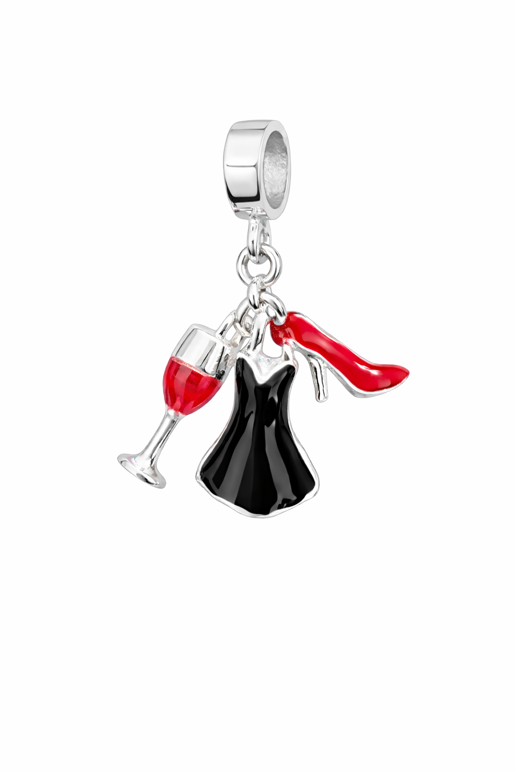 O berloque Noite & Elegância traduz charme e sofisticação em cada detalhe. Com design delicado que une vestido preto, taça de vinho e salto vermelho, a peça simboliza momentos especiais, feminilidade e estilo marcante. Produzido em prata com acabamento esmaltado, é perfeito para compor pulseiras cheias de personalidade. Compatível com pulseiras padrão.