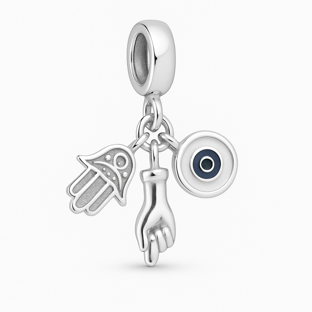 O berloque Trio de Proteção em Prata 925 reúne três símbolos tradicionais de boas energias: a Mão de Fátima, a Figa e o Olho Grego. Juntos, formam um amuleto completo para afastar negatividade e atrair sorte, luz e proteção. Uma peça cheia de significado para quem acredita no poder dos símbolos e deseja carregar vibrações positivas no dia a dia.