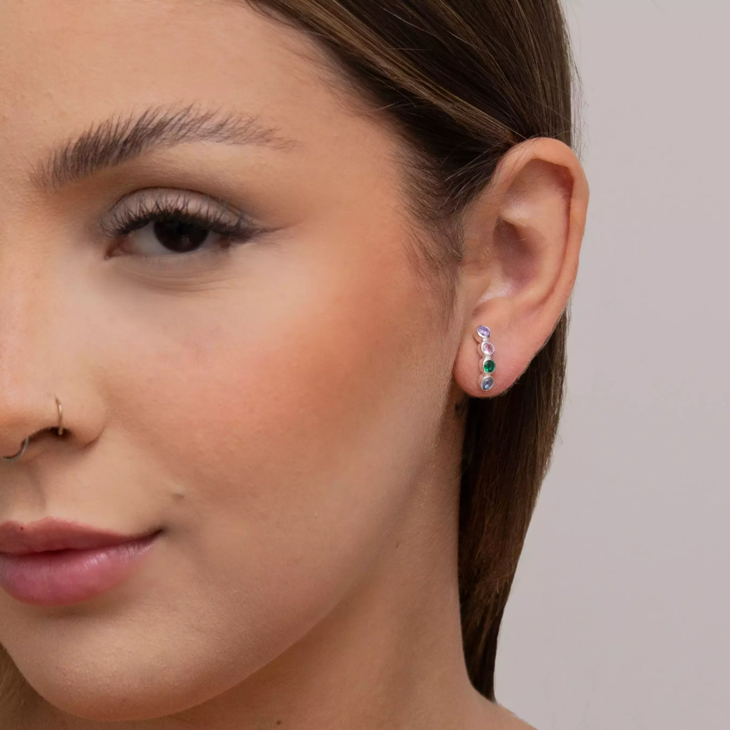 O Brinco Colorido Oval traz uma combinação harmoniosa de pedras nas cores azul, verde e rosa, que iluminam o visual com delicadeza.