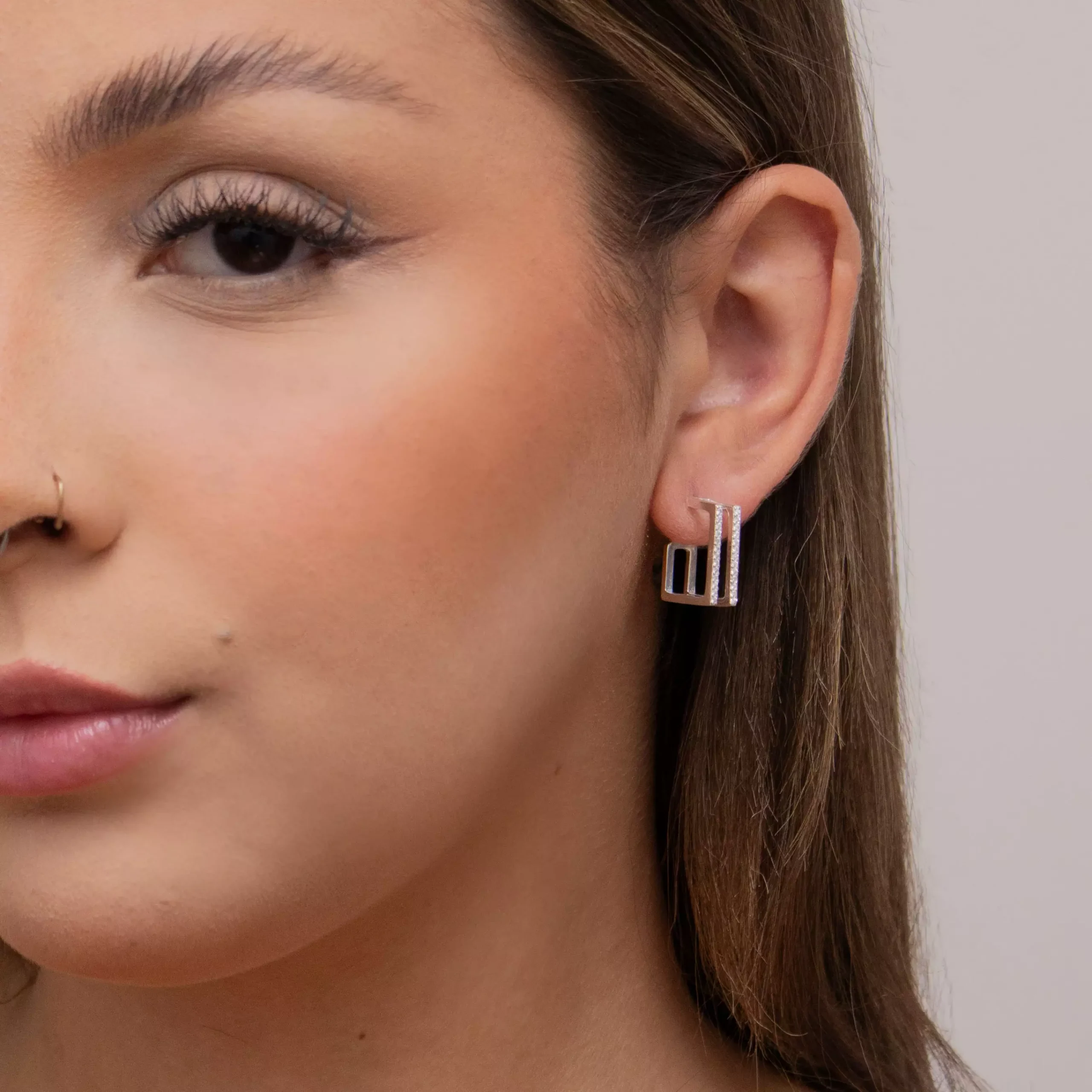O Brinco Quadrado Cravejado une design geométrico e sofisticação em uma peça moderna e elegante.