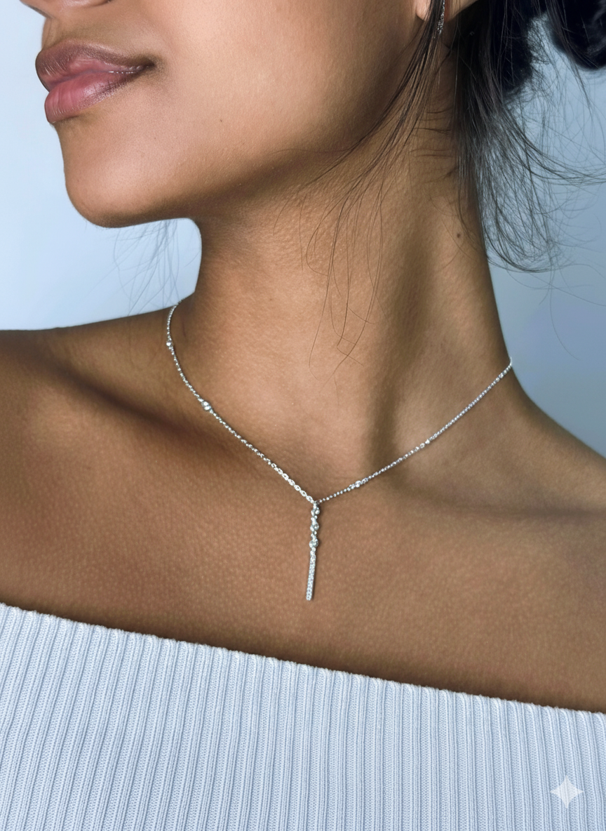 O Colar Barrinha Cravejada é a combinação perfeita entre delicadeza e sofisticação. Seu design moderno com pequenos pontos de luz e pingente alongado cravejado traz um brilho discreto e elegante.